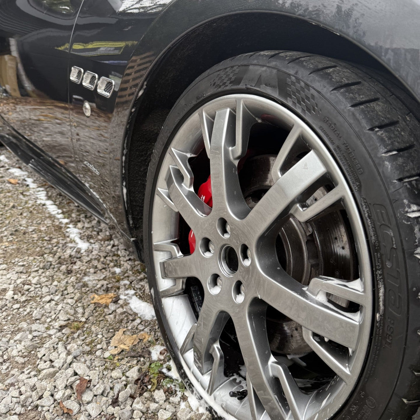 Spray wheel cleaner, agitate, rinse. Apply tyre dressing for a clean finish.