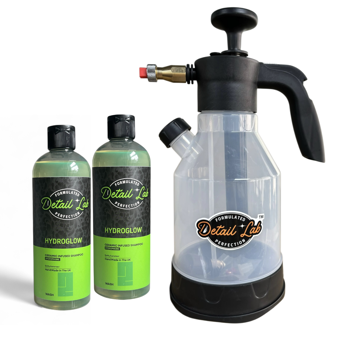 The Velocity Wash Bundle is designed for high-gloss, safe maintenance washes, pairing Detail-Lab Hydro Glo Ceramic Shampoo (x2) with our Velocity 2 Pump Sprayer, featuring metal nozzles for precise, durable application.